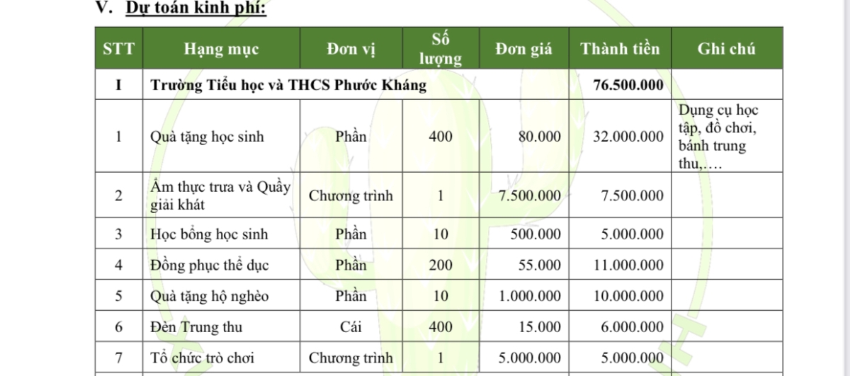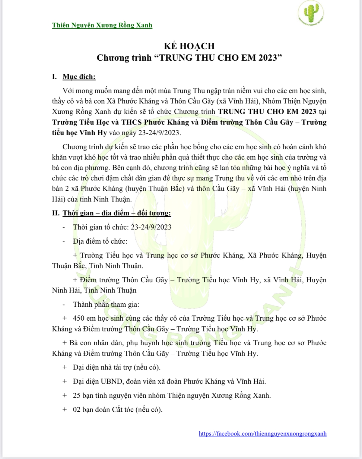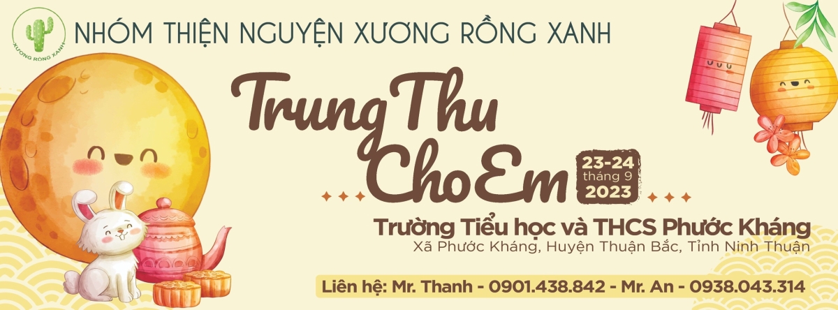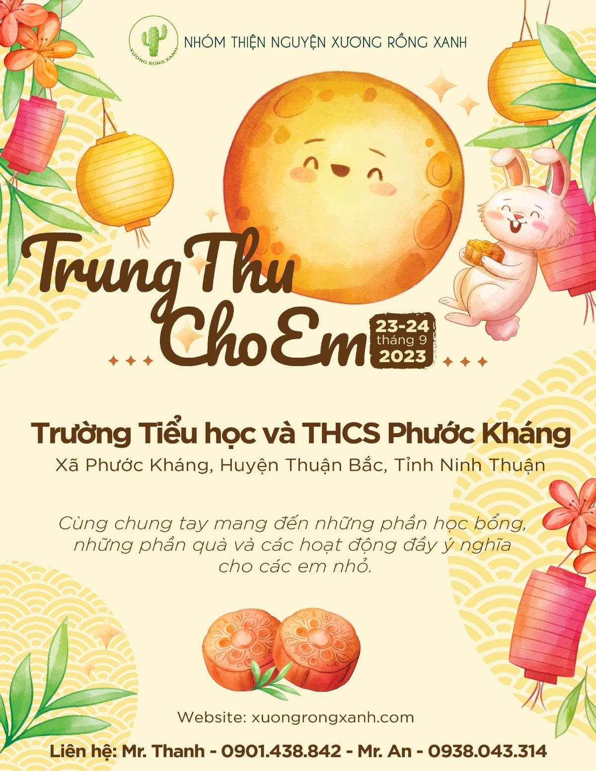 Với mong muốn chia sẻ một phần khó khăn với các em học sinh, thầy cô và bà con xã Phước Kháng và Thôn Cầu Gãy, Nhóm Thiện Nguyện Xương Rồng Xanh dự kiến sẽ tổ chức Chương trình TRUNG THU CHO EM tại Trường Tiểu học và Trung học cơ sở Phước Kháng và Điểm trường Thôn Cầu Gãy vào ngày 23 và 24/09/2023. Chương trình dự kiến sẽ trao 20 phần học bổng, hơn 400 phần quà thiết thực, tổ chức trao tặng, lắp đặt khu vui chơi thiếu nhi và tài trợ những chiếc xe đạp mới cho các em học sinh có hoàn cảnh khó khăn vượt khó học tốt. Bên cạnh đó, chương trình cũng sẽ lan tỏa những bài học ý nghĩa và tổ chức các trò chơi đậm chất dân gian để thực sự mang Trung thu về với các em nhỏ nơi đây.