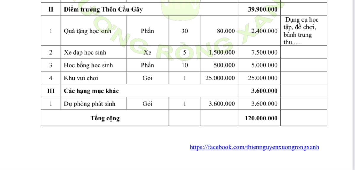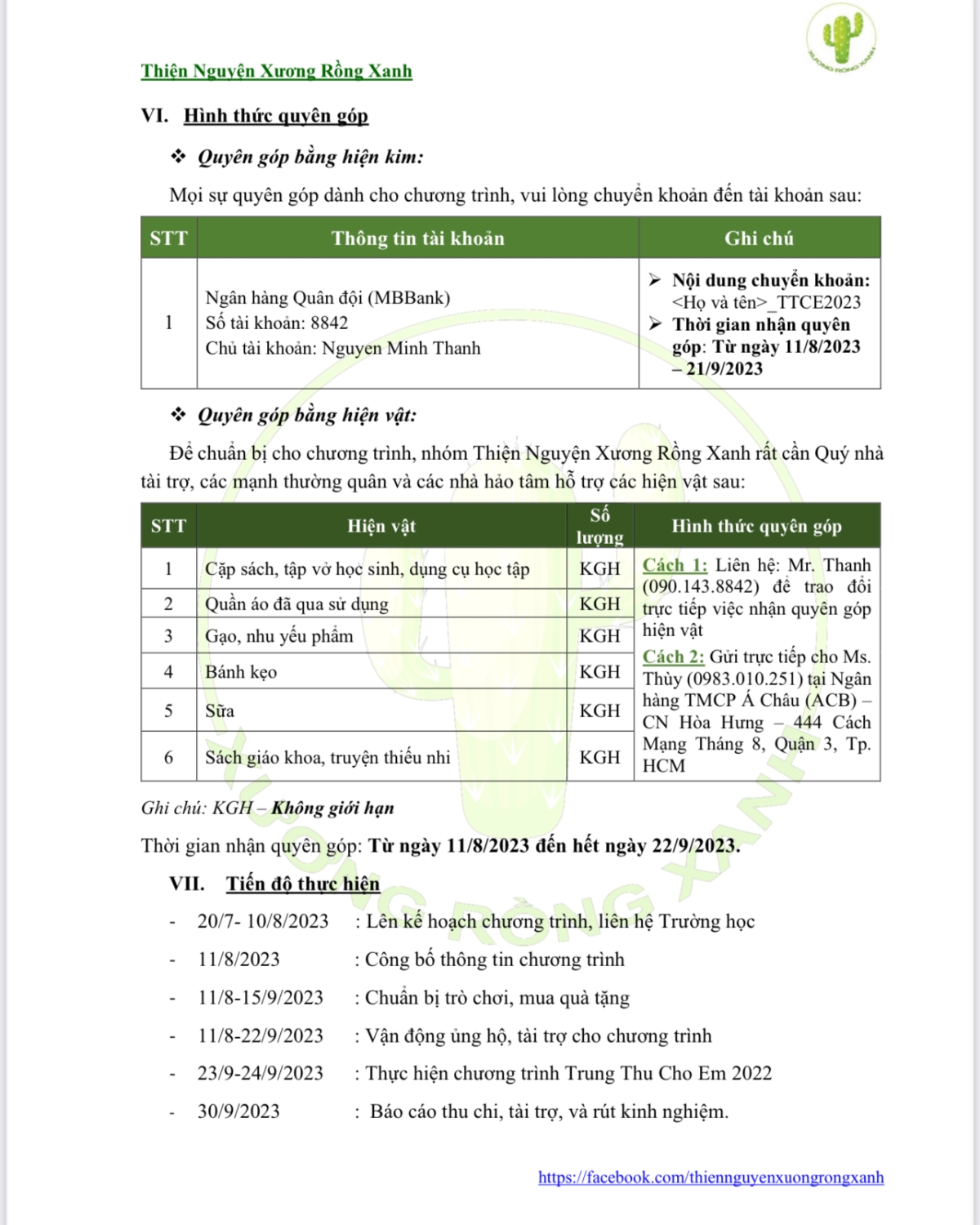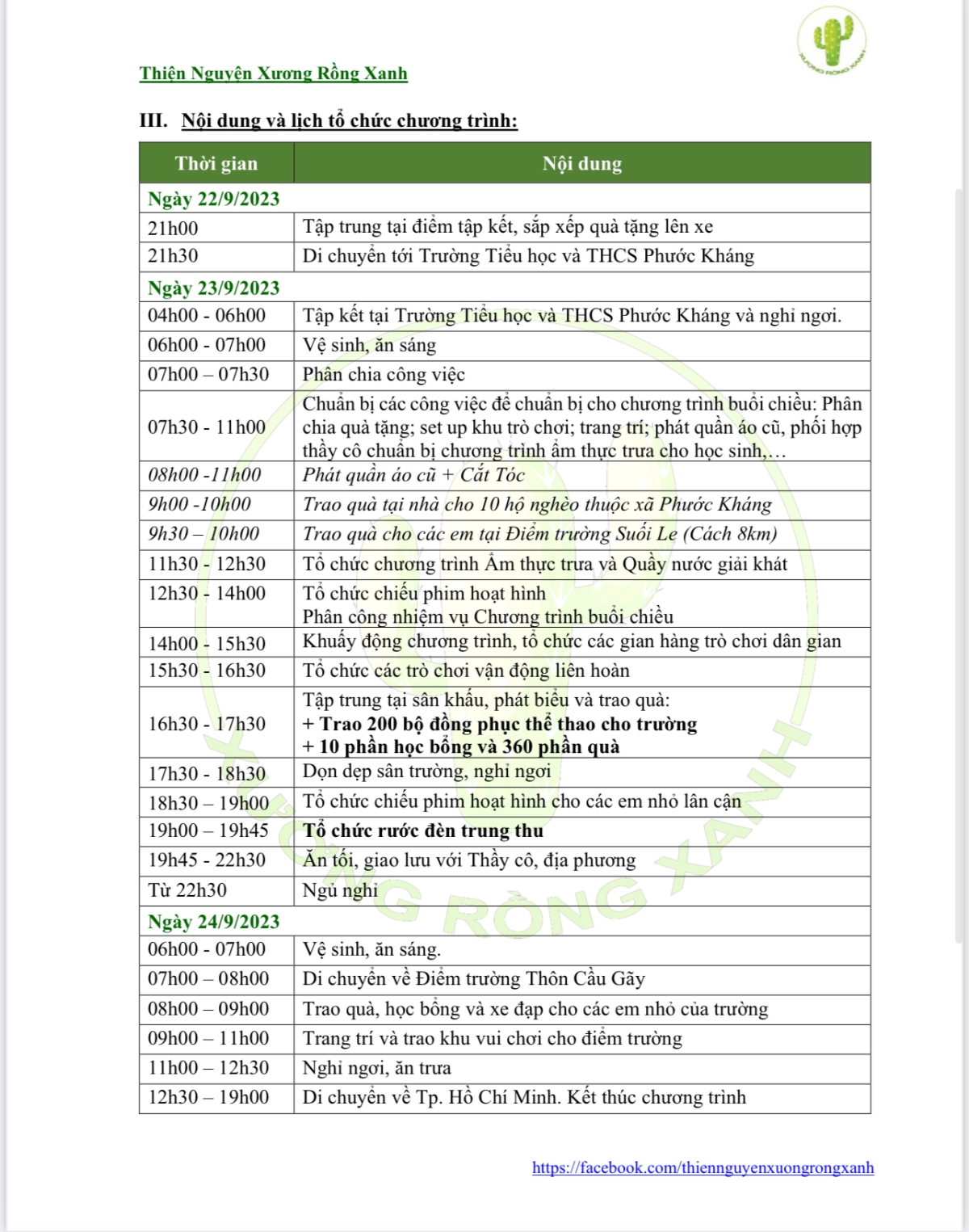 Với mong muốn chia sẻ một phần khó khăn với các em học sinh, thầy cô và bà con xã Phước Kháng và Thôn Cầu Gãy, Nhóm Thiện Nguyện Xương Rồng Xanh dự kiến sẽ tổ chức Chương trình TRUNG THU CHO EM tại Trường Tiểu học và Trung học cơ sở Phước Kháng và Điểm trường Thôn Cầu Gãy vào ngày 23 và 24/09/2023. Chương trình dự kiến sẽ trao 20 phần học bổng, hơn 400 phần quà thiết thực, tổ chức trao tặng, lắp đặt khu vui chơi thiếu nhi và tài trợ những chiếc xe đạp mới cho các em học sinh có hoàn cảnh khó khăn vượt khó học tốt. Bên cạnh đó, chương trình cũng sẽ lan tỏa những bài học ý nghĩa và tổ chức các trò chơi đậm chất dân gian để thực sự mang Trung thu về với các em nhỏ nơi đây.