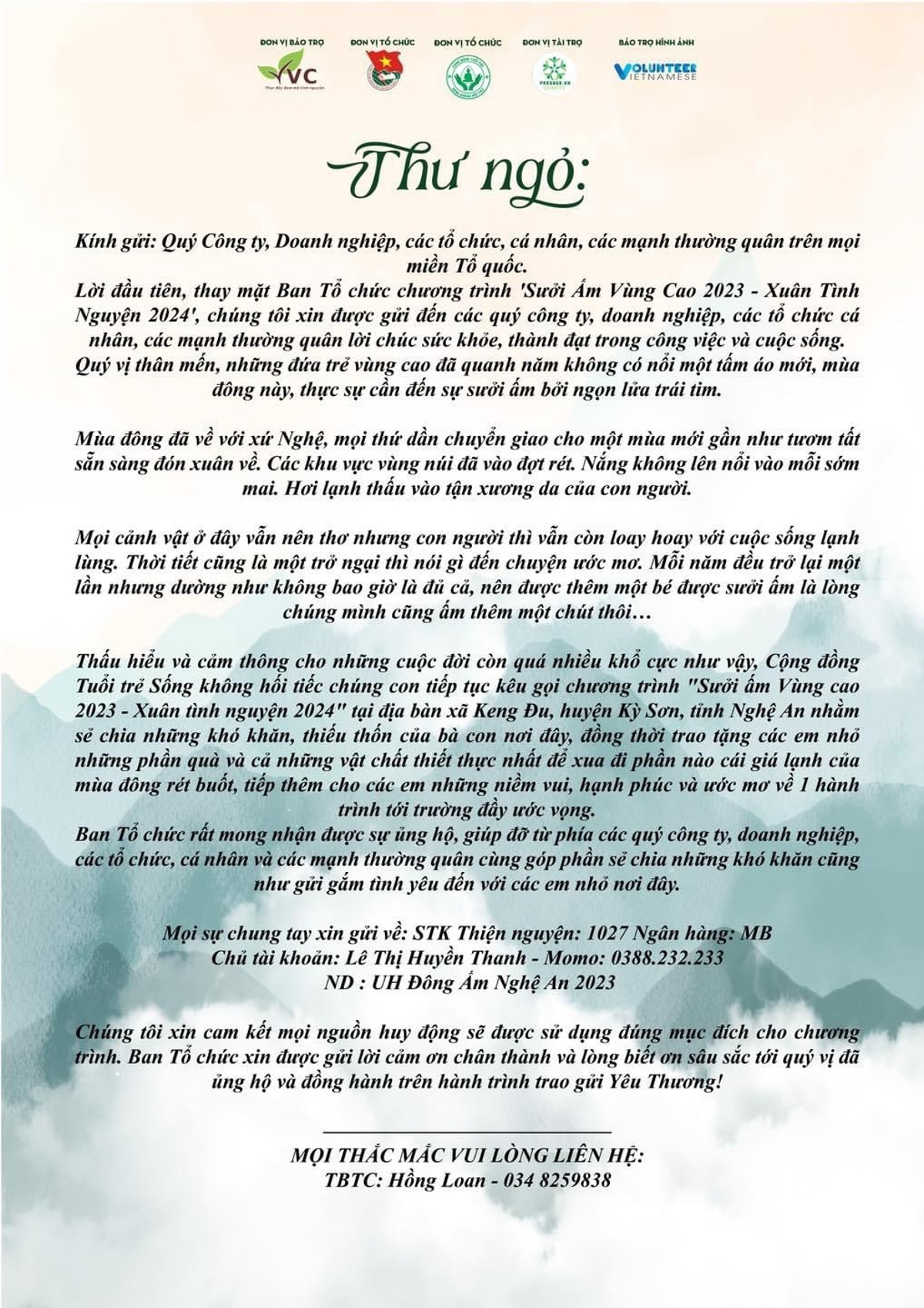 Thấu hiểu và cảm thông cho những cuộc đời còn quá nhiều khổ cực như vậy, Cộng đồng Tuổi trẻ Sống không hối tiếc chúng con tiếp tục kêu gọi chương trình "Sưởi ấm Vùng cao 2023 - Xuân tình nguyện 2024" tại địa bàn xã Keng Đu, huyện Kỳ Sơn, tỉnh Nghệ An nhằm sẻ chia những khó khăn, thiêu thôn của bà con nơi đây, đông thời trao tặng các em nhỏ những phân quà và cả những... Xem thêm