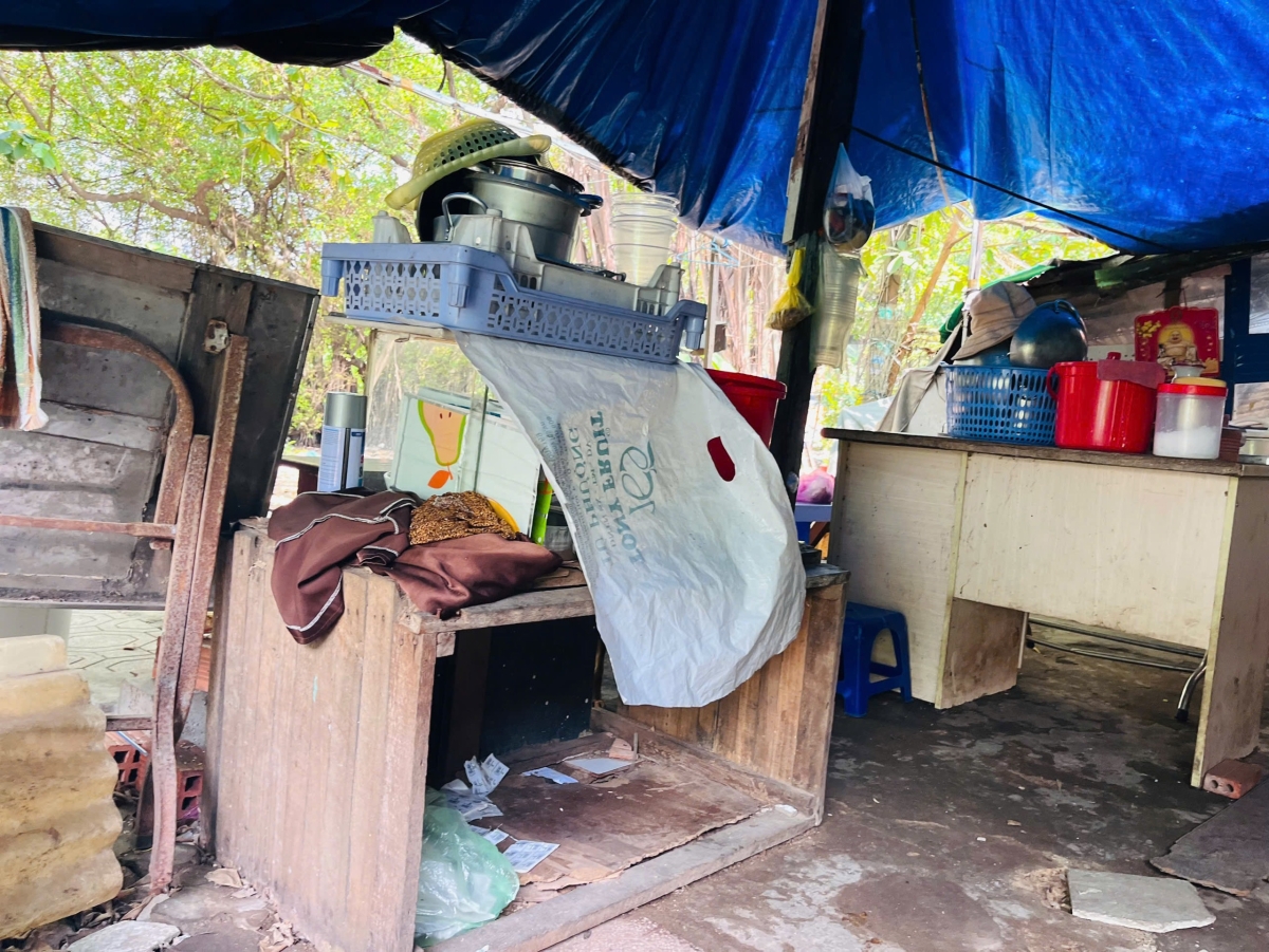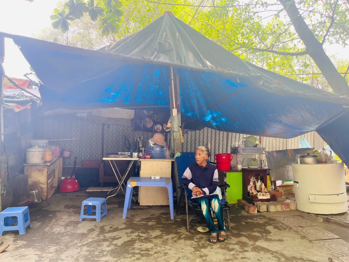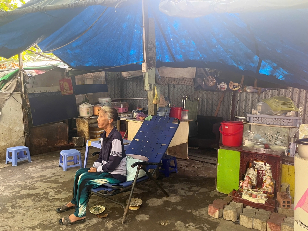 Thương cảm cho hoàn cảnh của bà và Gđ ,chính quyền địa phương đã cho Gđ bà cất tạm “ căn nhà” trên khu đất giải thể , được bà con gần đó thương cho bà vài tấm tôn bạc cũ che tạm. Hiện nay căn chòi đã xuống cấp nghiêm trọng, bong tróc, mất khả năng liên kết, các trụ nhà cũng đã mục rỗng, chỉ cần một cơn gió to cũng dễ dàng “ quật” đổ . Bà cho biết có nhưng hôm trời mưa không còn chỗ để trú, phải trú nhờ mái hiên người ta. Chứ mưa ướt hết không còn chỗ để ngủ.