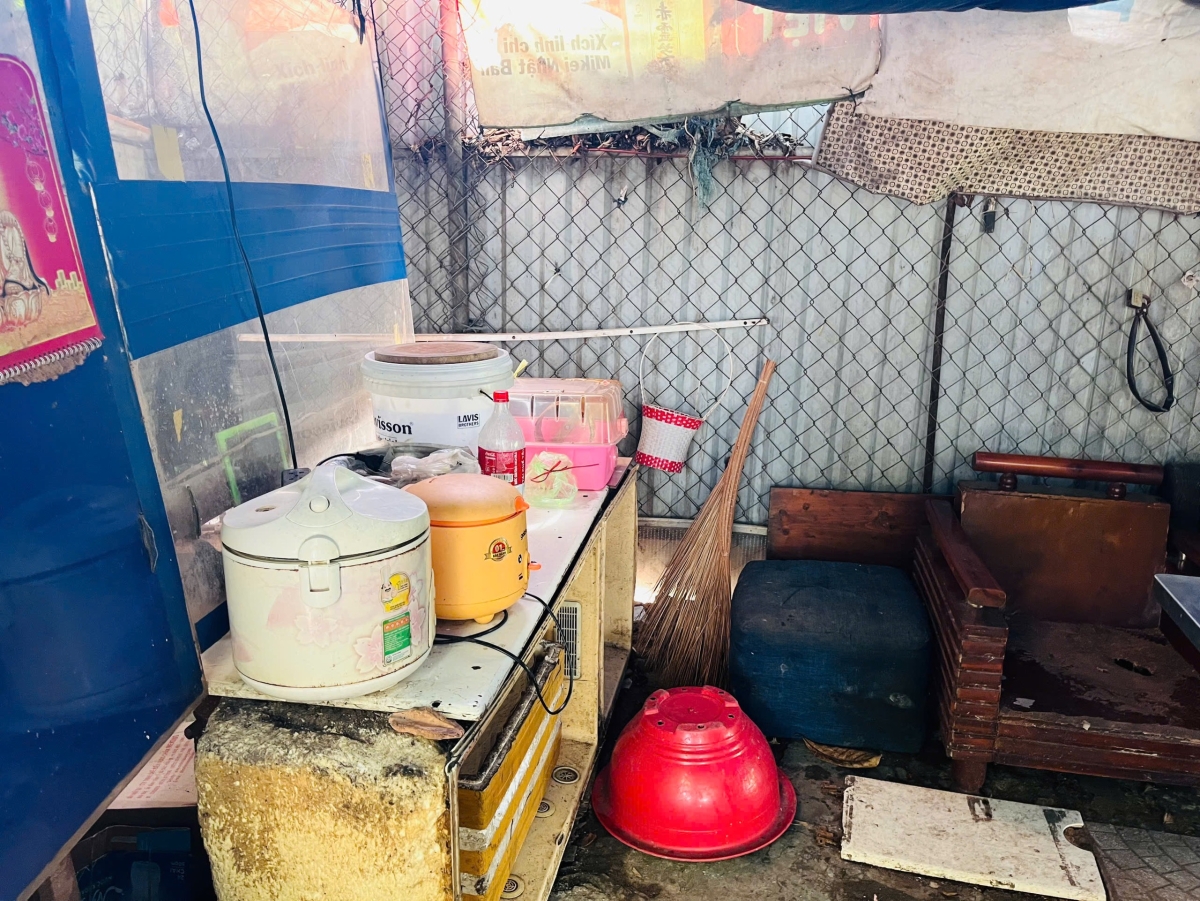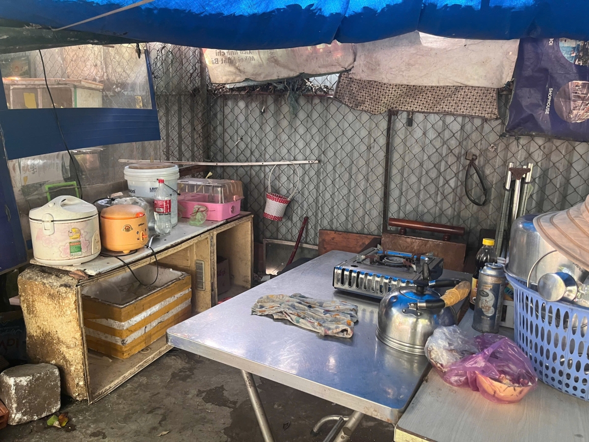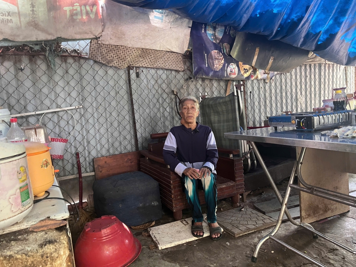 Thương cảm cho hoàn cảnh của bà và Gđ ,chính quyền địa phương đã cho Gđ bà cất tạm “ căn nhà” trên khu đất giải thể , được bà con gần đó thương cho bà vài tấm tôn bạc cũ che tạm. Hiện nay căn chòi đã xuống cấp nghiêm trọng, bong tróc, mất khả năng liên kết, các trụ nhà cũng đã mục rỗng, chỉ cần một cơn gió to cũng dễ dàng “ quật” đổ . Bà cho biết có nhưng hôm trời mưa không còn chỗ để trú, phải trú nhờ mái hiên người ta. Chứ mưa ướt hết không còn chỗ để ngủ.