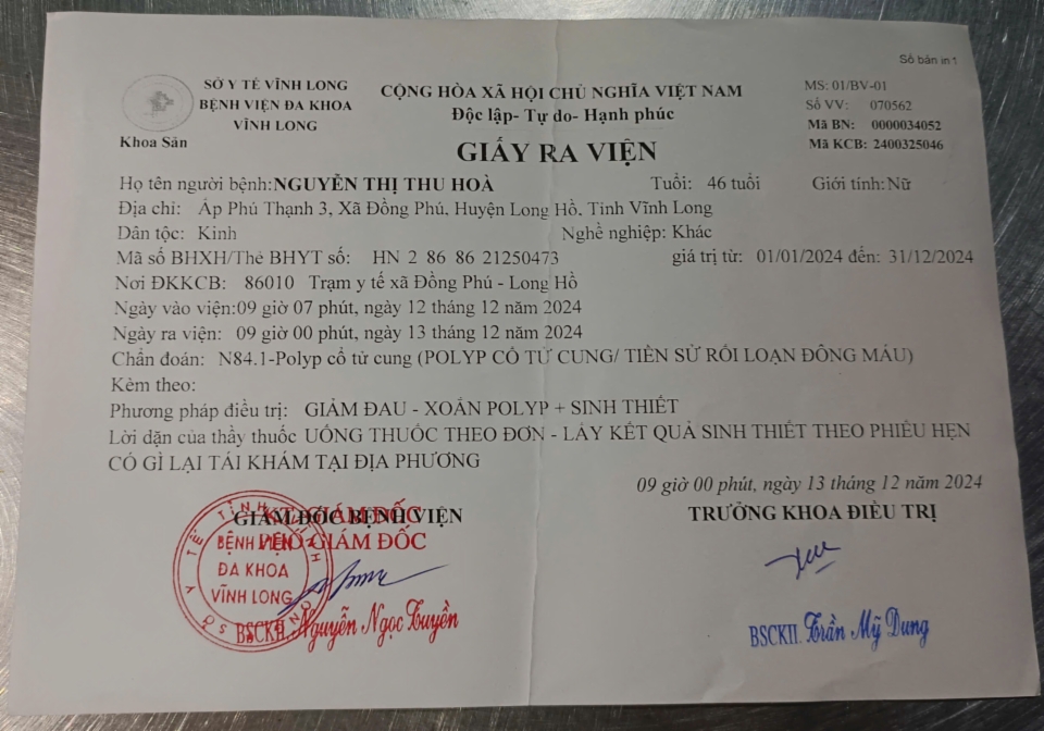 Chị mắt bệnh cườm nước ở mắt, hiện tại mắt trái đã không còn thấy ánh sáng, mắt phải nhìn rất mờ. Chị mắc thêm bệnh rối loạn đông máu, khối u ở vú ( đã phẩu thuật) và hiện tại bên vú còn lại cũng phát hiện khối u nhưng không đủ điều kiện tầm soát, xét nghiệm sinh thiết và điều trị. Gần đây chị phải nhập viện điều trị và phẫu thuật cắt polyp cổ tử cung, tình hình sức khoẻ của chị rất yếu không thể lao động. Trước đây làm nghề bóc cơm nhãn ( thu nhập 50.000đ/1 ngày).