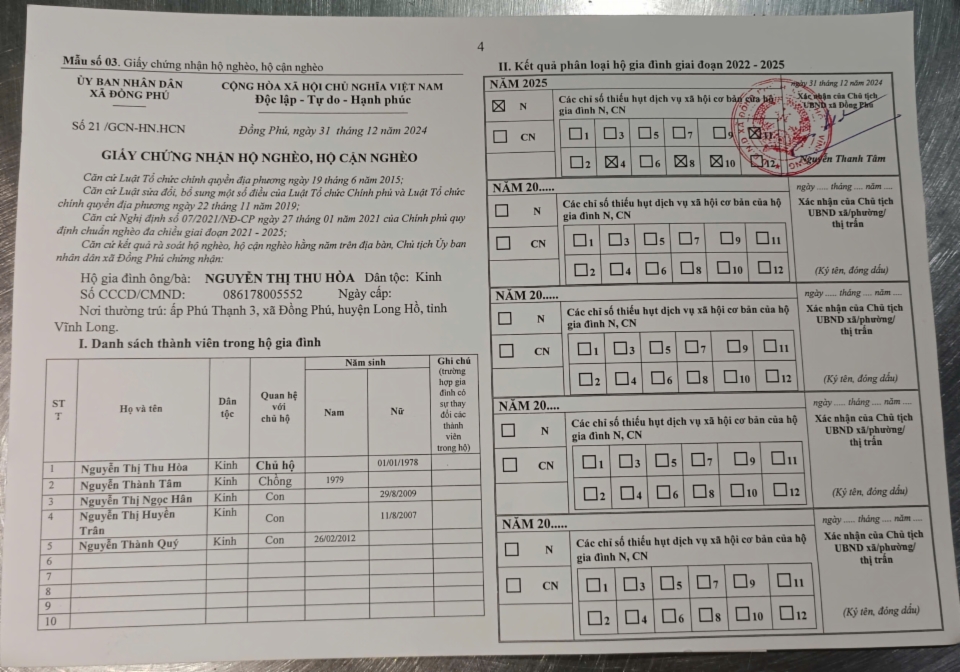 Vận động hỗ trợ Quý Mạnh thường quân đến hoàn cảnh của gia đình chị Nguyễn Thị Thu Hoà sinh năm 1978 cư ngụ ấp Phú Thạnh 3, xã Đồng Phú, huyện Long Hồ. Hoàn cảnh gia đình khó khăn thuộc diện hộ nghèo của xã sống trong căn nhà tình thương do xã vận động xây dựng.Cả 2 vợ chồng hiện tại không thể tạo ra thu nhập.