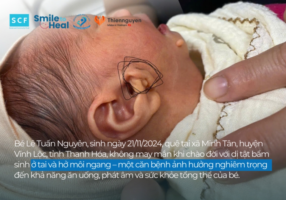 💔 Bé Lê Tuấn Nguyên, sinh ngày 21/11/2024, quê tại xã Minh Tân, huyện Vĩnh Lộc, tỉnh Thanh Hóa, không may mắn khi chào đời với dị tật bẩm sinh ở tai và hở môi ngang – một căn bệnh ảnh hưởng nghiêm trọng đến khả năng ăn uống, phát âm và sức khỏe tổng thể của bé.