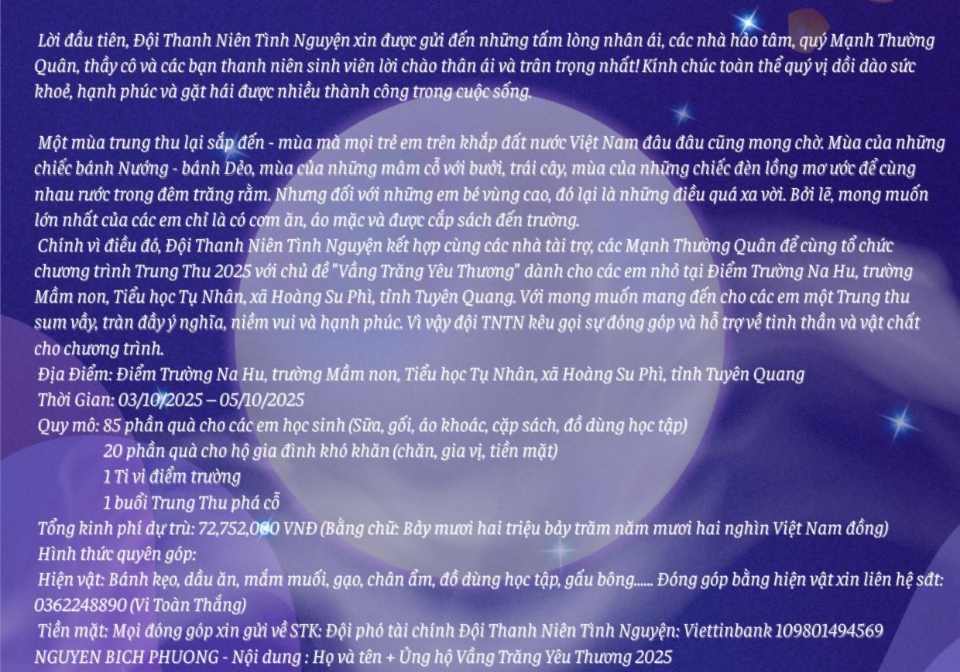 🍂 Trên điểm trường Na Hu – ngôi trường nhỏ nằm chênh vênh giữa núi, con đường đến lớp lầy lội bùn đất mỗi khi mưa xuống – những đôi mắt trẻ thơ vẫn ánh lên niềm mong chờ. Chính từ những khát khao ấy, chúng mình – Đội TNTN HUBT – đã nối tiếp hành trình “Vầng Trăng Yêu Thương 2025”.