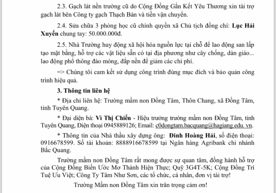 📢📢 KÊU GỌI XÂY DỰNG 2 PHÒNG HỌC MỚI CHO ĐIỂM TRƯỜNG MẦM NON THÔN NHẠ, TRƯỜNG MẦM NON ĐỒNG TÂM, XÃ ĐỒNG TÂM, TỈNH TUYÊN QUANG.