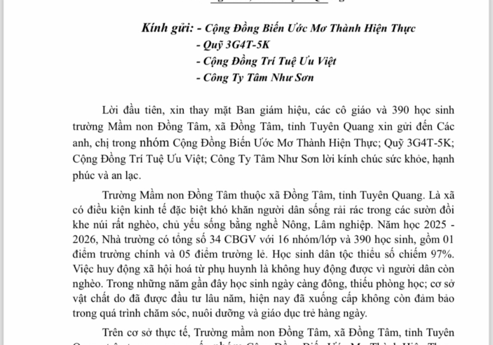 Trên cơ sở thực tế, Trường mầm non Đồng Tâm, xã Đồng Tâm, tỉnh Tuyên Quang trân trọng mong muốn nhóm Cộng Đồng Biến Ước Mơ Thành Hiện Thực; Quỹ 3G4T-5K; Cộng Đồng Trí Tuệ Ưu Việt; Công Ty Tâm Như Sơn tài trợ hỗ trợ xây dựng Điểm trường thôn Nhạ, trường mầm non Đồng Tâm: