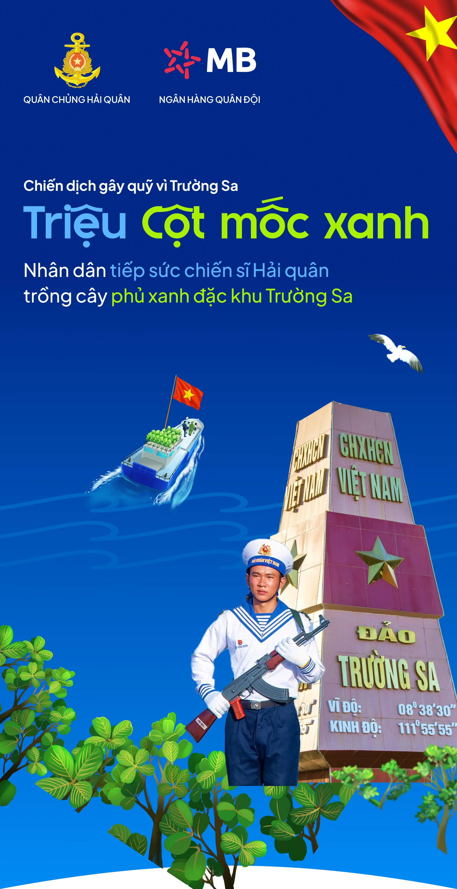 Chiến dịch “Triệu cột mốc xanh” do Ngân hàng TMCP Quân đội (MB) phối hợp cùng Quân chủng Hải quân triển khai với mục tiêu gây quỹ cộng đồng nhằm trồng mới 1 triệu cây xanh tại đặc khu Trường Sa, góp phần tăng khả năng phòng thủ tự nhiên, cải thiện môi trường sống cho cán bộ, chiến sĩ, khẳng định vững chắc chủ quyền biển đảo của Tổ quốc. Chương trình được MB cam kết đóng góp 50 tỷ đồng và hỗ trợ kết nối nguồn lực xã hội thông qua các sáng kiến công nghệ.